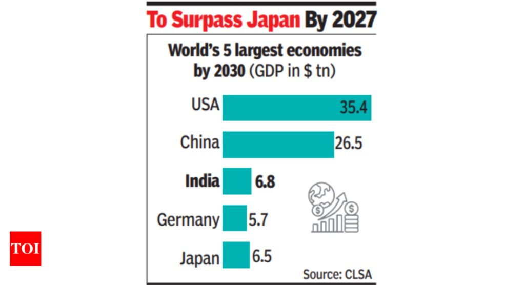 MUMBAI: By 2052 – in less than 30 years from now and five years after the government-christened Amrit Kaal ends in 2047 – India could surpass the US to be the world’s largest economy with a nominal GDP of $45 trillion, a report by foreign broking major CLSA said. It also said that by 2027, India will surpass Japan to be the world’s third largest economy and by 2047, the end of the Amrit Kaal, it will be a $29 trillion economy.