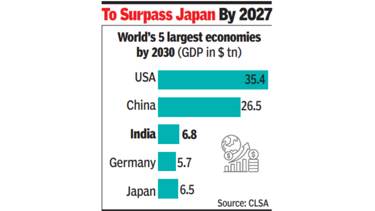MUMBAI: By 2052 – in less than 30 years from now and five years after the government-christened Amrit Kaal ends in 2047 – India could surpass the US to be the world’s largest economy with a nominal GDP of $45 trillion, a report by foreign broking major CLSA said. It also said that by 2027, India will surpass Japan to be the world’s third largest economy and by 2047, the end of the Amrit Kaal, it will be a $29 trillion economy.
