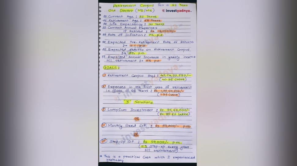 The image depicts a page from a notebook that explains a retirement plan in its entirety. “Retirement Corpus for a 32-Year-Old Doctor (MD/MS)” is the title of the document. Yellow and orange highlighters have been used to mark all of the important numbers. (Also Read: Deadline Approaching For SBI Amrit Kalash FD Scheme: Earn High Interest With The Plan – Explore Complete Information Inside)