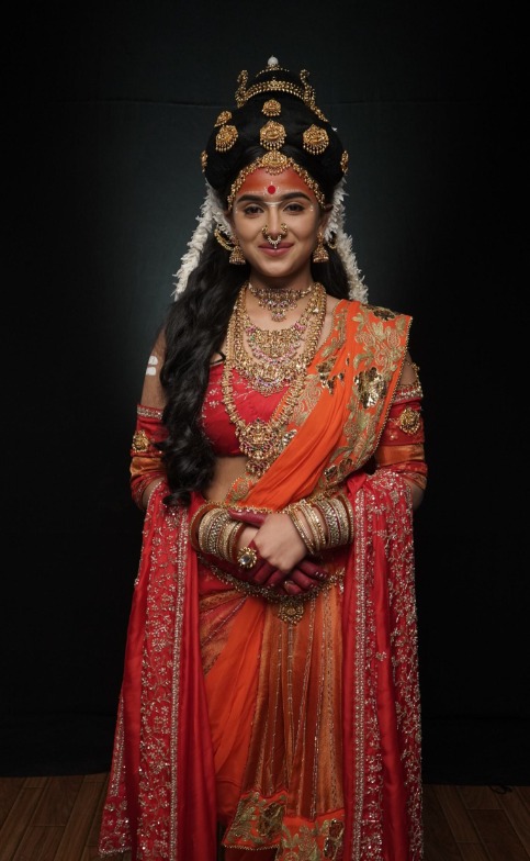 Sayli Salunkhe as Anjani embodies grace and divinity. She wears an apsara-inspired look crafted by murti artists from Kumartuli. The headgear of the Apsara look is made of Shola (shreds of wood). The makeup and styling are inspired by the Alpona art, adding richness to her divine look. Arav Chowdharry as Kesari, the noble king, is adorned in a mustard-red silk woven drape. His crown is designed to resemble India’s ancient mountains and terrains, symbolizing his strength and righteousness as a warrior and a father.